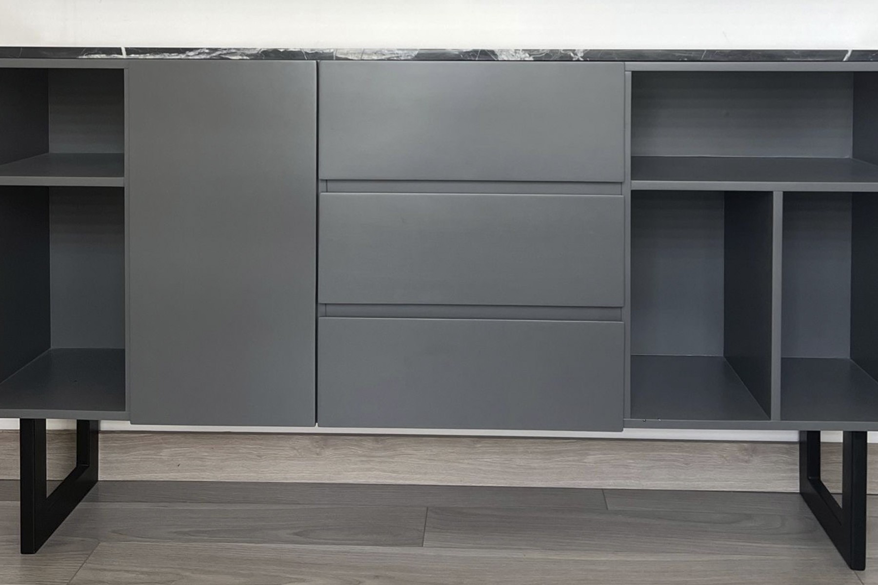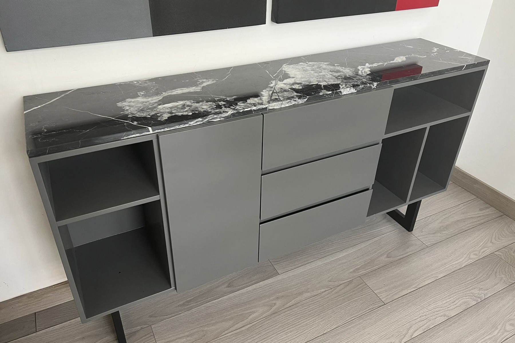 Cómoda laca mate gris con cubierta mármol negro
