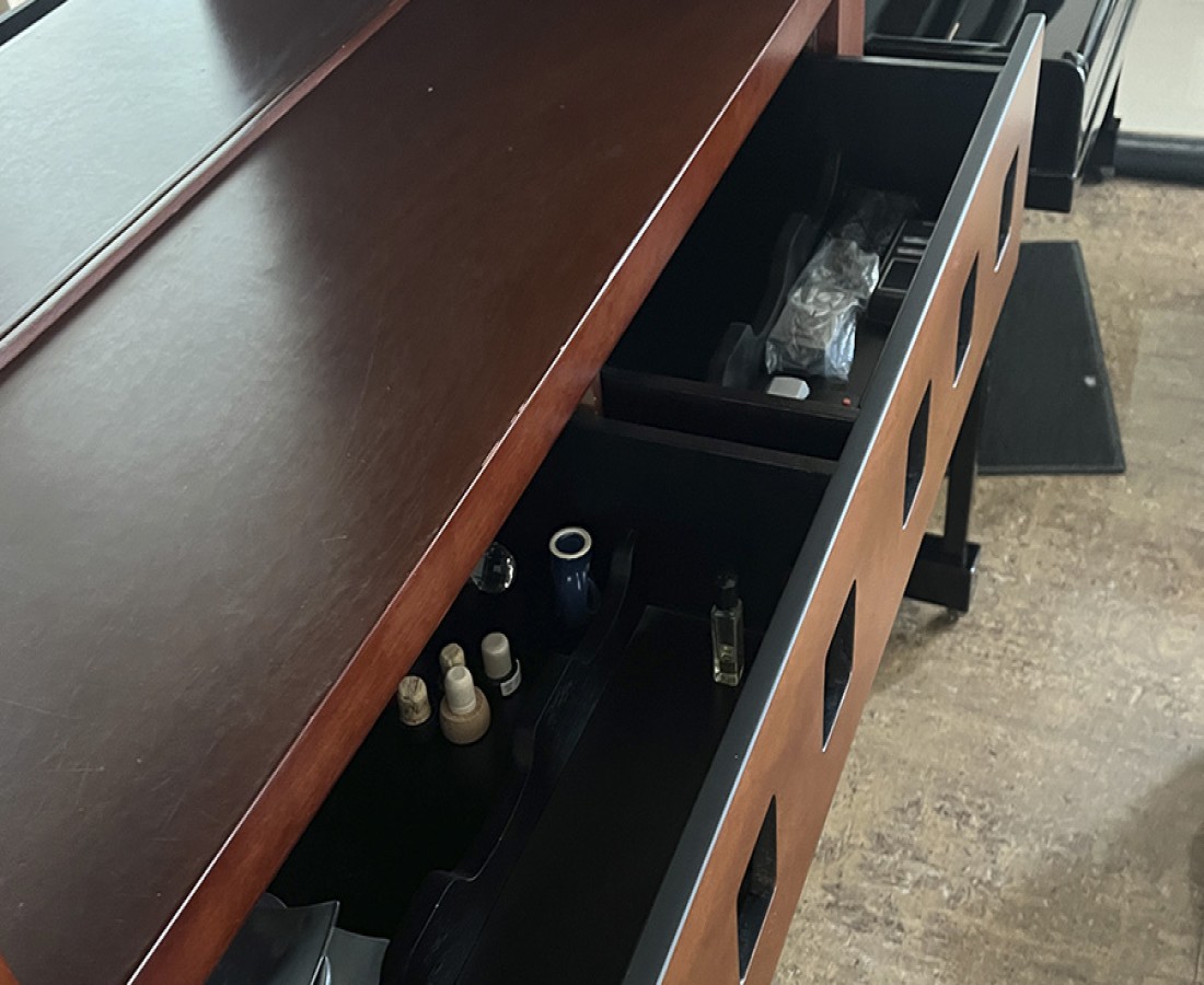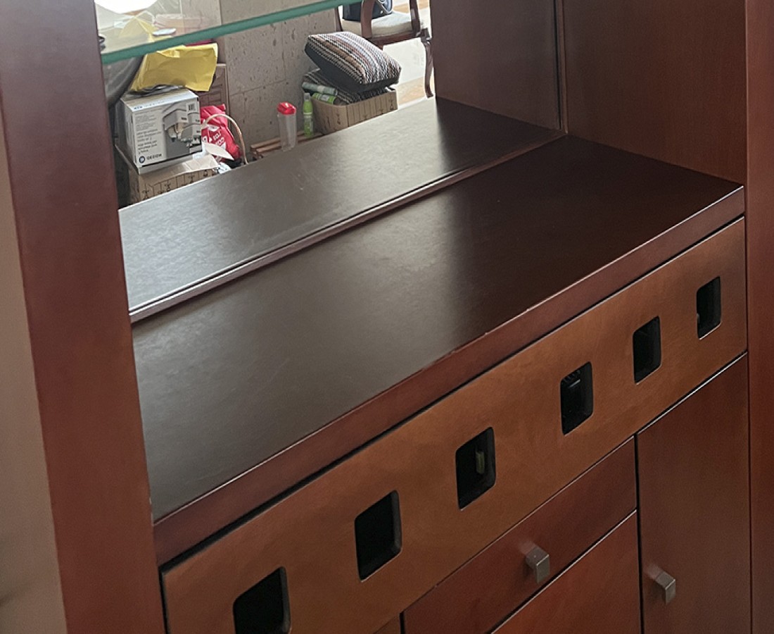 Mueble de madera con espejo y cajones, es la parte de atrás de una barra