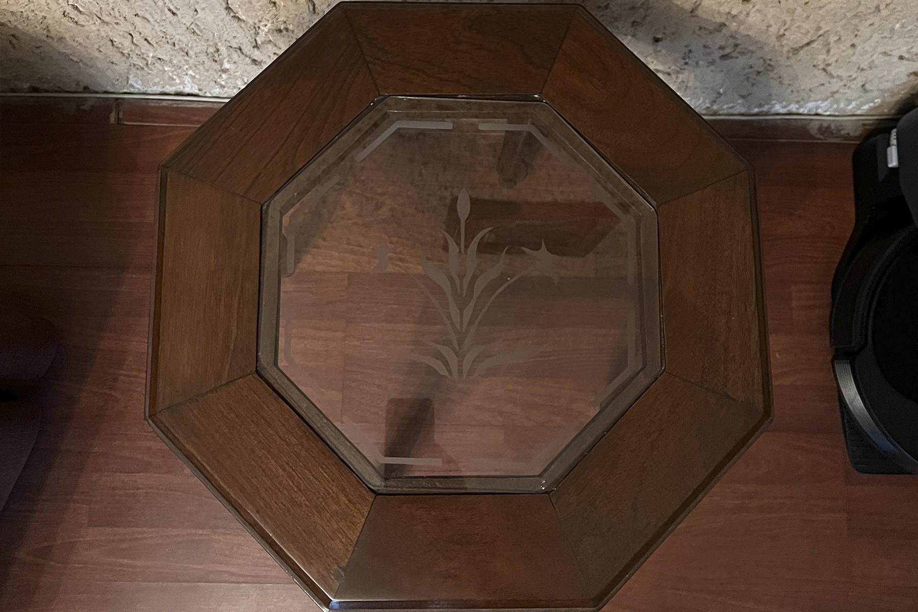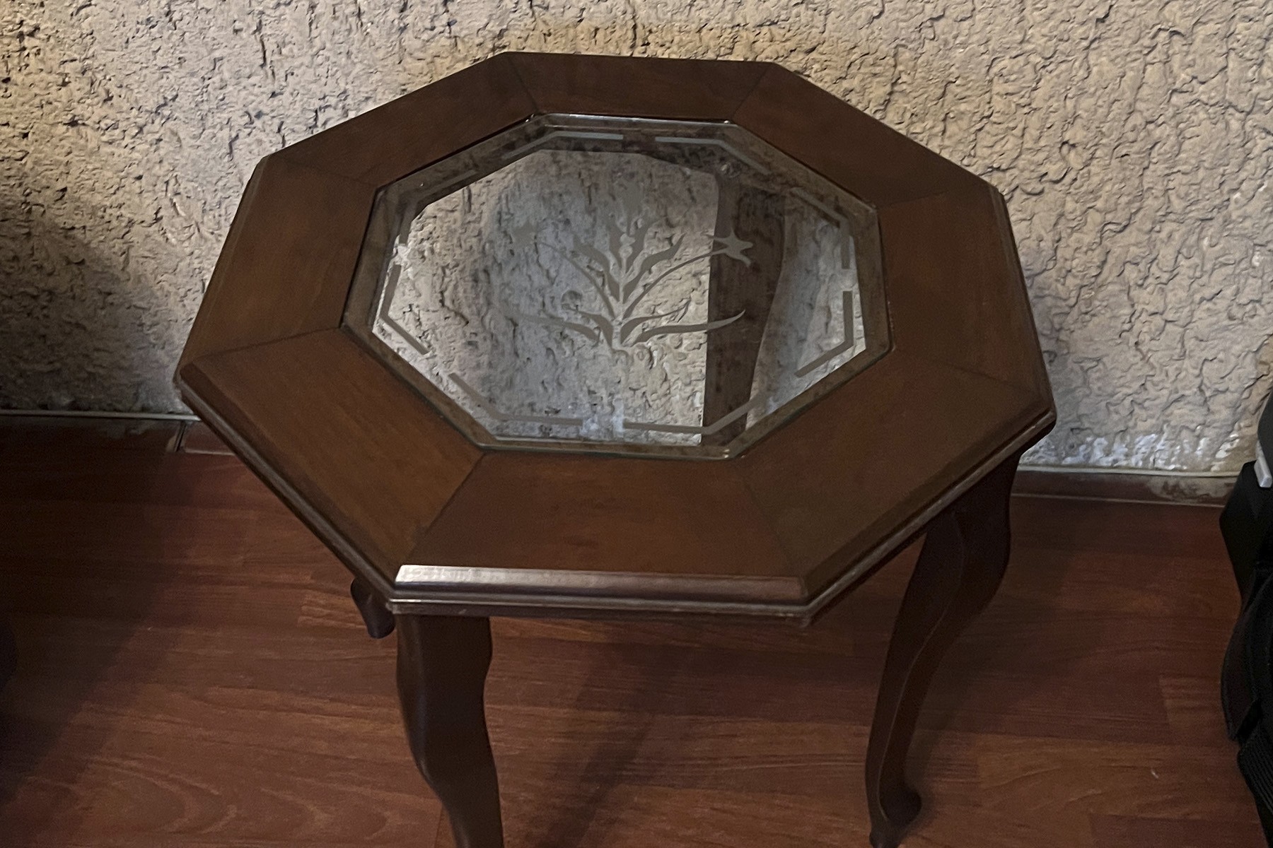 Juego de 3 mesas octagonales de madera de encino con cristal